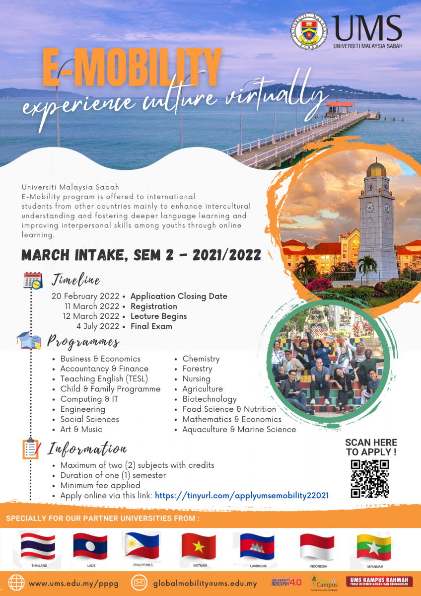 We are pleased to inform you that Universiti Malaysia Sabah (UMS) is currently offering an E-Mobility Program for Undergraduate for the Semester 2 - 2021/2022, March 2022 intake. Most courses will be taught in English and few are taught in Malay. Each student can take up to two (2) Courses within the same Faculty for the length of one semester. Students from our partner Universities with UMS will receive a tuition fee waive.