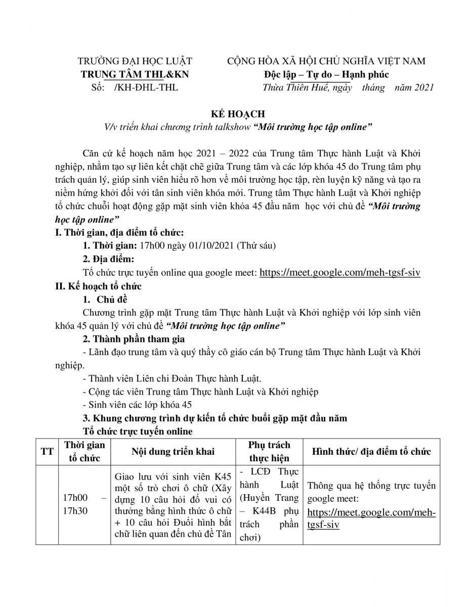 KẾ HOẠCH CHƯƠNG TRÌNH TALKSHOW "MÔI TRƯỜNG HỌC TẬP ONLINE"