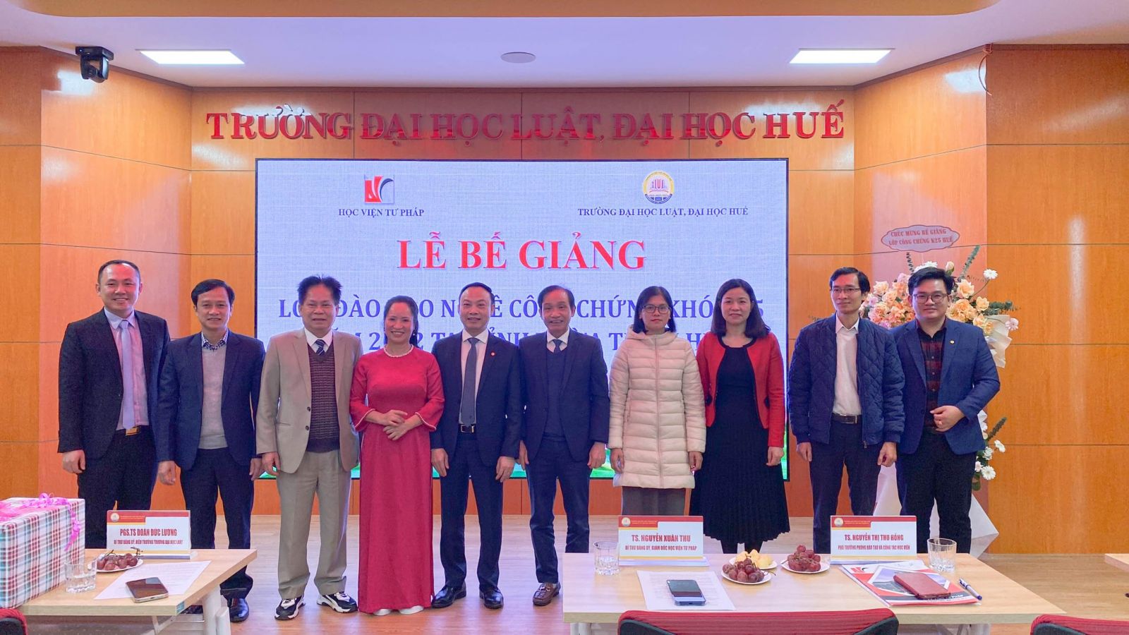 Về phía Trường Đại học Luật, Đại học Huế có: PGS.TS. Đoàn Đức Lương, Bí thư Đảng uỷ, Hiệu trưởng; PGS.TS. Nguyễn Duy Phương, Phó Bí thư Đảng uỷ, Phó Hiệu trưởng; TS. Lê Thị Hải Ngọc, Giám đốc Trung tâm Tư vấn pháp luật – Đào tạo ngắn hạn cùng các đồng chí trong Đảng ủy, trưởng, phó các đơn vị và toàn thể học viên lớp Đào tạo nghề Công chứng.