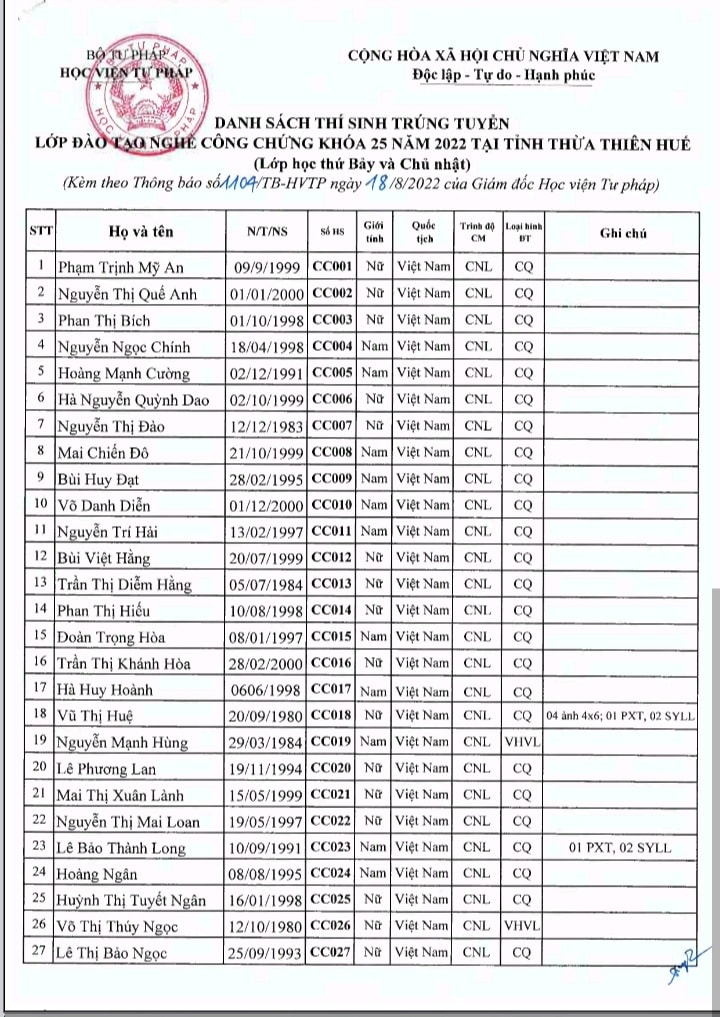 THÔNG BÁO NHẬP HỌC LỚP ĐÀO TẠO NGHỀ CÔNG CHỨNG KHOÁ 25 NĂM 2022 TẠI TỈNH THỪA THIÊN HUẾ