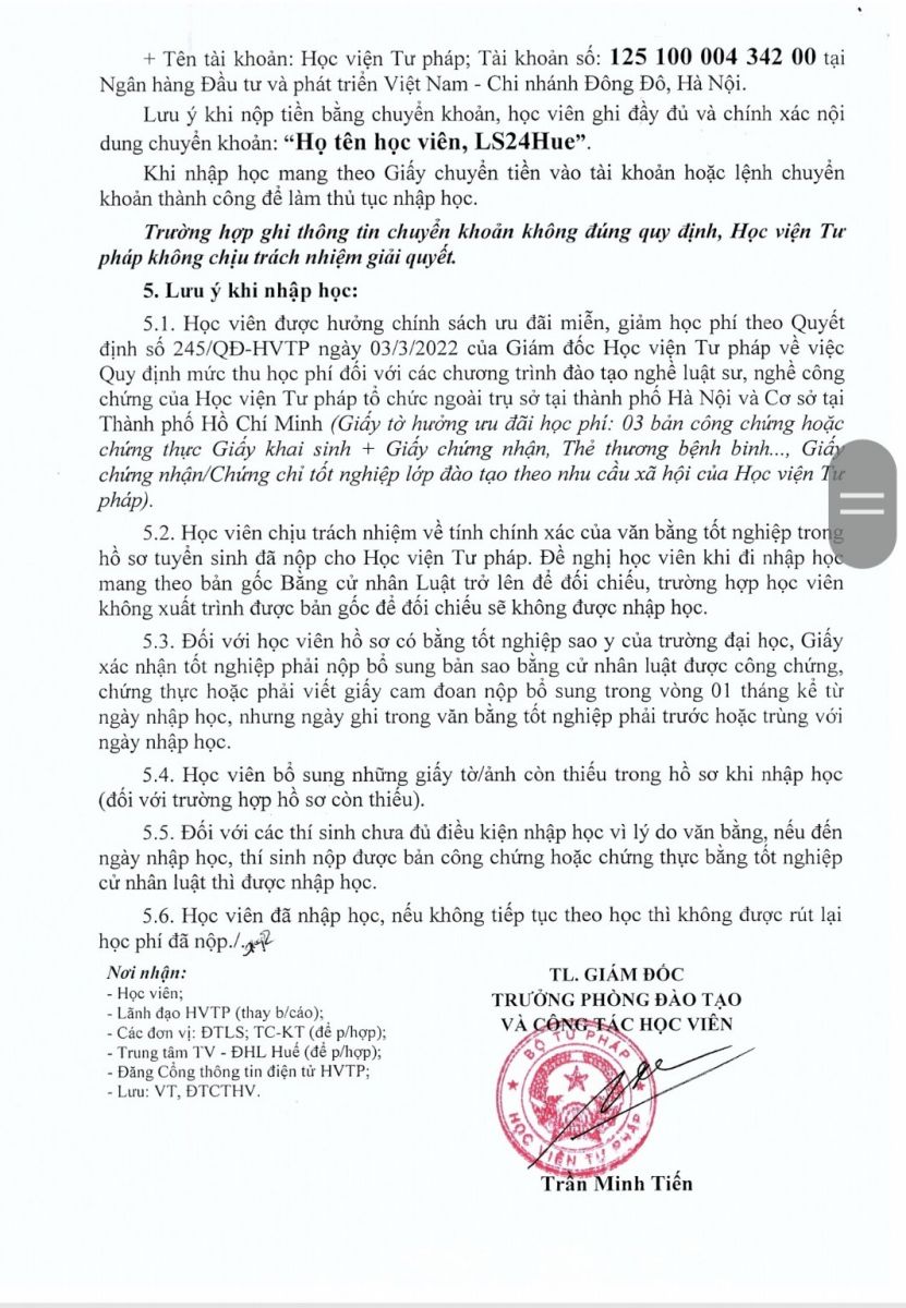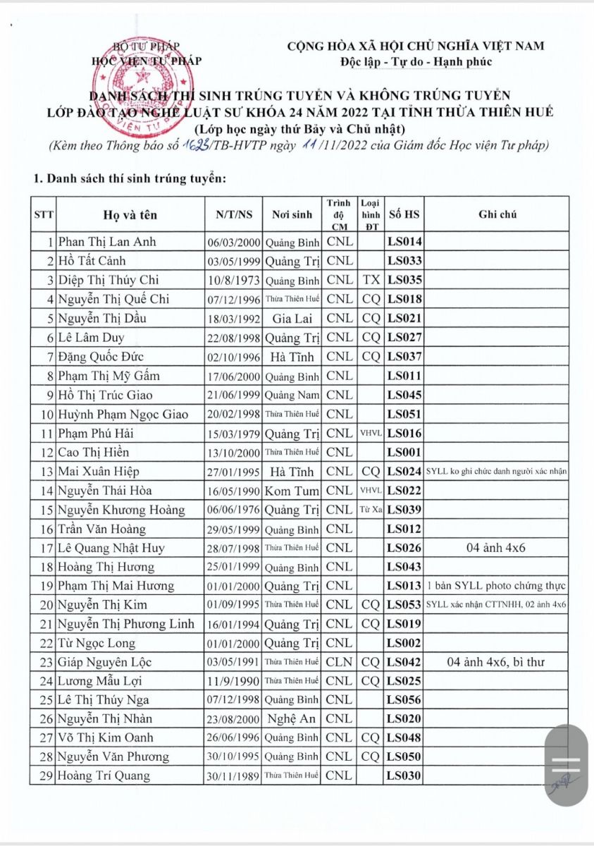 THÔNG BÁO NHẬP HỌC LỚP ĐÀO TẠO NGHỀ LUẬT SƯ KHOÁ 24 NĂM 2022 TẠI TỈNH THỪA THIÊN HUẾ