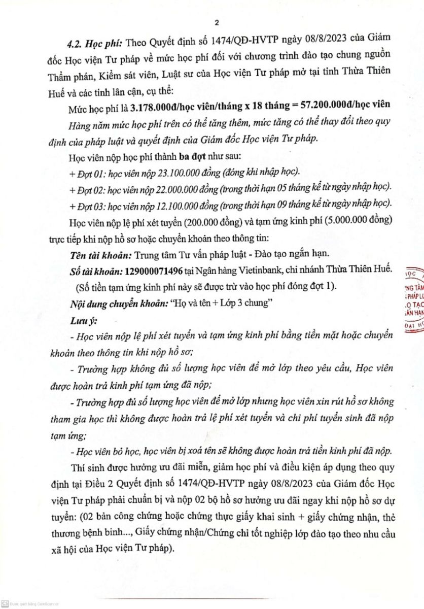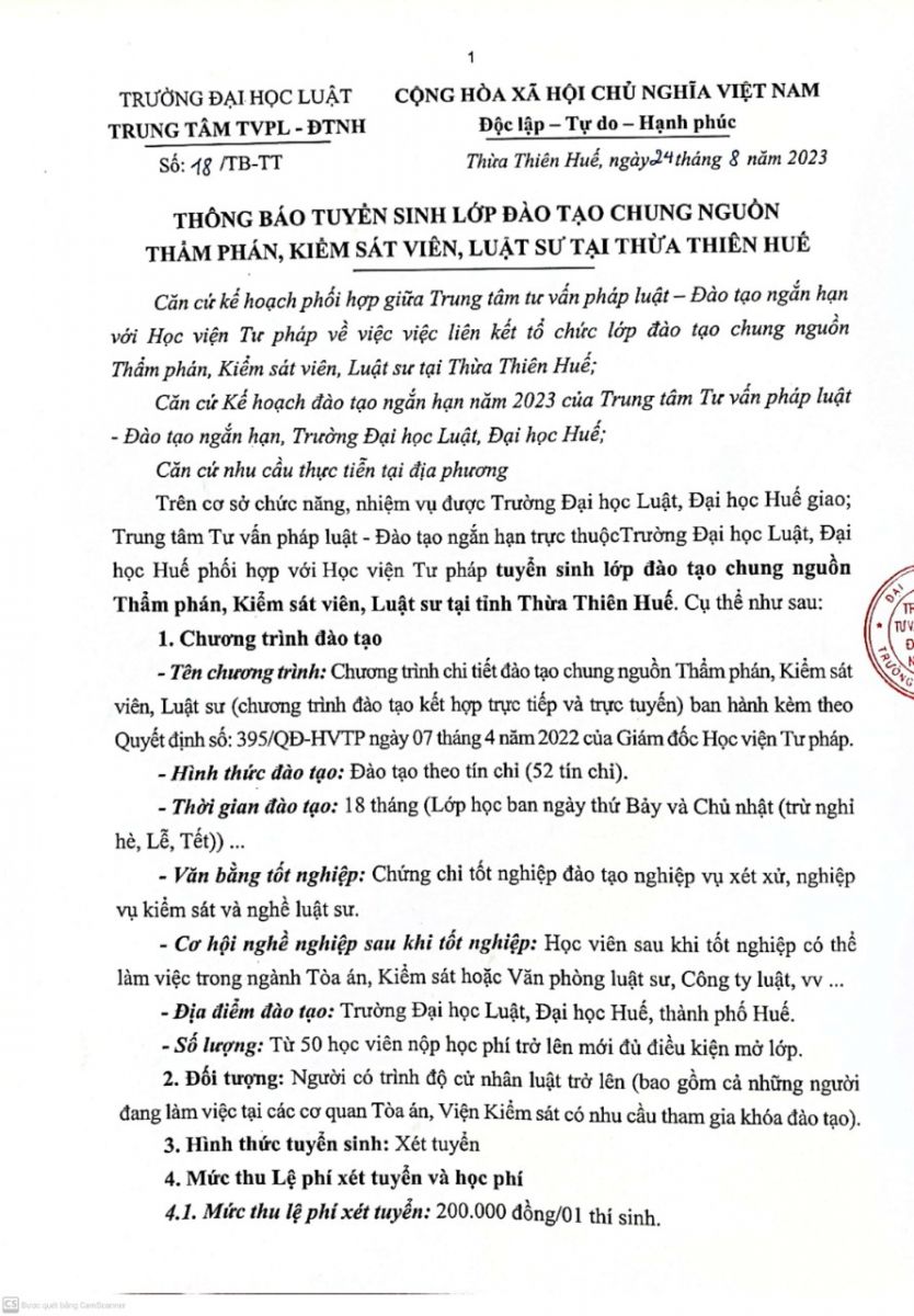 THÔNG BÁO TUYỂN SINH LỚP ĐÀO TẠO CHUNG NGUỒN THẨM PHÁN, KIỂM SÁT VIÊN, LUẬT SƯ TẠI THỪA THIÊN HUẾ.